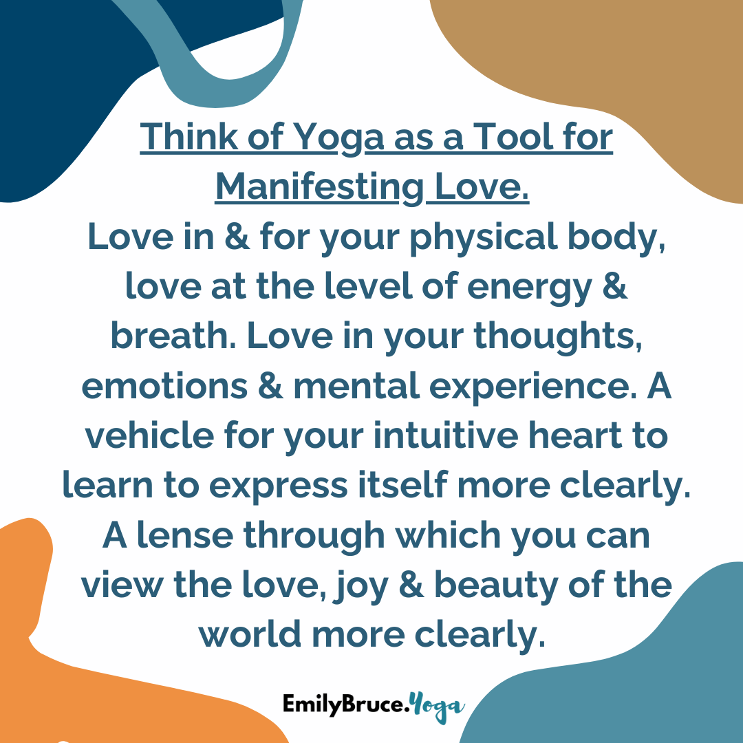 Think of Yoga as a Tool for Manifesting Love. Love in and for your physical body, love at the level of your energy and breath. Love in your thoughts, emotions and mental experience. A vehicle for your intuitive heart to learn to express itself more clearly. A lense through which you can view the love, joy and beauty of the world more clearly.